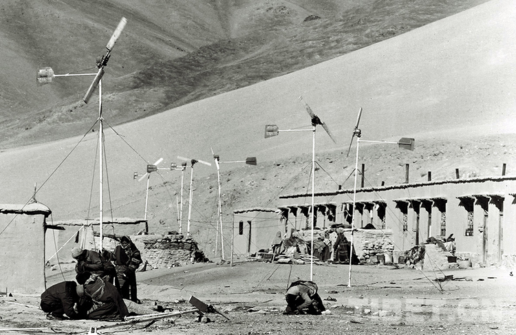這是那曲地區(qū)(現(xiàn)那曲市)風能實驗站的技術工人在幫助嘎措鄉(xiāng)一村村民維修保養(yǎng)風力發(fā)電機(唐召明1988年攝)