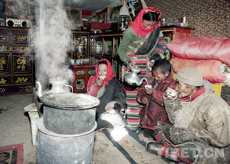 這是雙湖辦事處(現(xiàn)雙湖縣)嘎措鄉(xiāng)一村老牧人達加一家,正在新居里喝酥油茶(唐召明1988年攝)