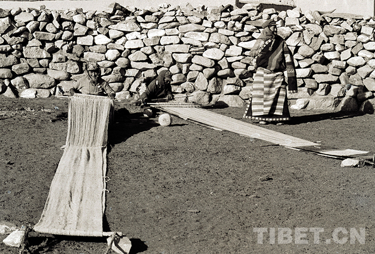 這是雙湖辦事處(現(xiàn)雙湖縣)嘎措鄉(xiāng)一村牧女坐在石砌大羊圈的干羊糞層上織氆氌(唐召明1988年攝)