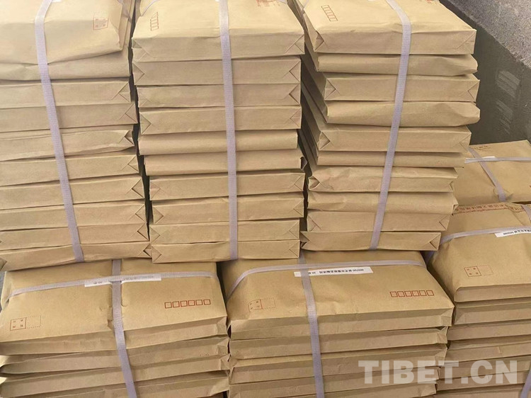 圖為工作人員正在打包發(fā)往基層的《漢藏對照術語規(guī)范明鏡》(2021)
