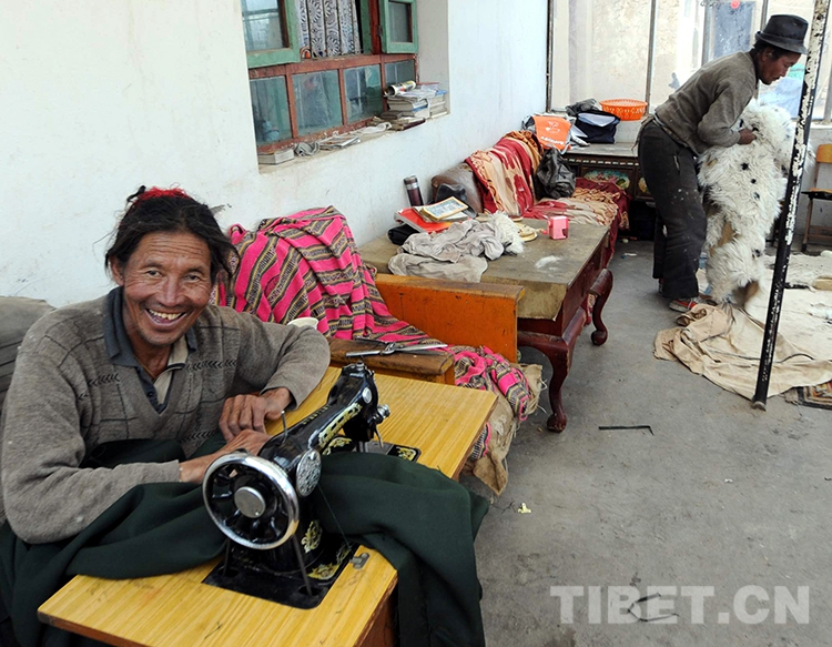 這是嘎措鄉(xiāng)縫紉組牧人在縫制藏裝。他們的專(zhuān)業(yè)化勞動(dòng),到年底也是按照工分的高低,按勞取酬(唐召明2009年攝)