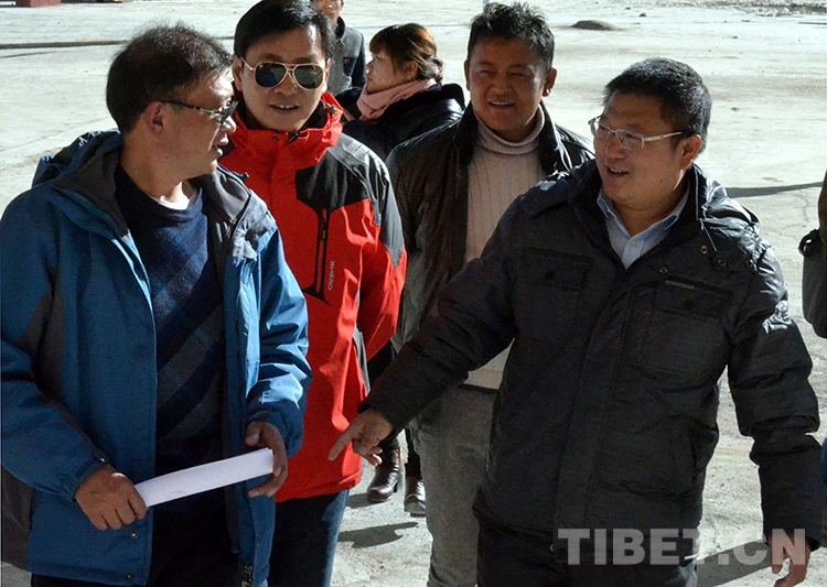 這是中國石化援藏干部王鵬雁(右一)在中國石化小學(xué)二期工程驗(yàn)收現(xiàn)場同其他縣領(lǐng)導(dǎo)進(jìn)行交流(扎西2014年10月25日攝)