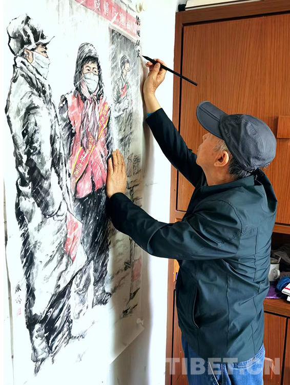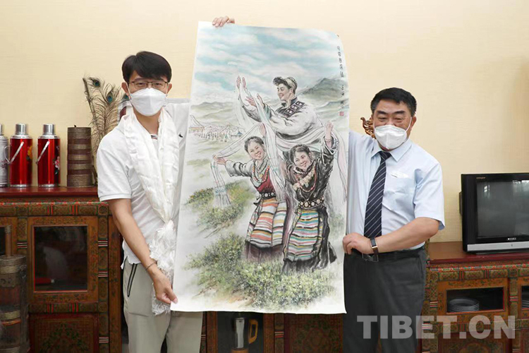“我愛人看到了咱們館(西藏文化博物館)發(fā)的征稿啟事,然后就把這條信息發(fā)到家庭群里邊。過了不久,我父親說他畫了一張畫,讓我看看畫得怎么樣。我當時還很意外,本來想鼓勵我兒子畫一張,結果我兒子沒畫,老爺子畫得還很好?!?月21日,張兆林先生將自己的作品《哈達寄深情》捐贈給西藏文化博物館,張兆林之子張安誠將作品送至博物館并收到了捐贈證書。
