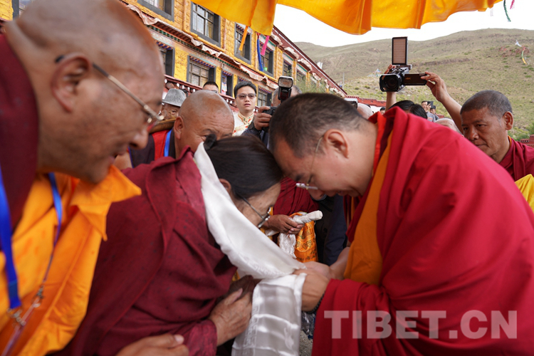 現(xiàn)年80歲高齡的桑頂?多吉帕姆德慶曲珍活佛在僧人的攙扶下前來迎接,班禪見到桑頂多吉帕姆活佛疾步向前,與桑頂多吉帕姆活佛互獻(xiàn)哈達(dá),行碰頭禮,互致問候。