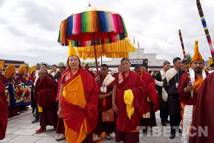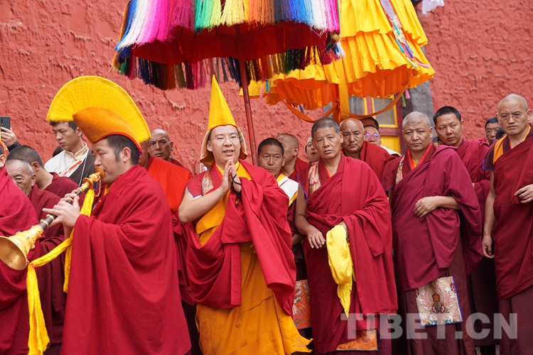 班禪抵達(dá),現(xiàn)場(chǎng)桑煙繚繞,法號(hào)聲悠長(zhǎng),扎什倫布寺僧眾以藏傳佛教最高禮儀迎接班禪?,F(xiàn)場(chǎng)等候班禪的信教群眾紛紛摘帽行禮或雙手合十,向班禪的到來(lái)表示熱烈歡迎,班禪見(jiàn)狀揮手致意、送上祝福。隨后,班禪在手持黃傘、香爐的高僧引領(lǐng)下緩緩步行至措欽大殿。