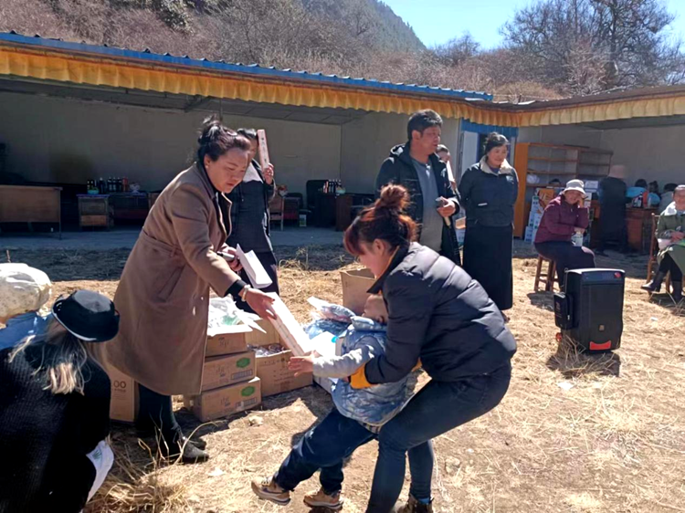 圖為亞夏(右三)在豐收節(jié)上為大家發(fā)放文體趣味活動(dòng)紀(jì)念品