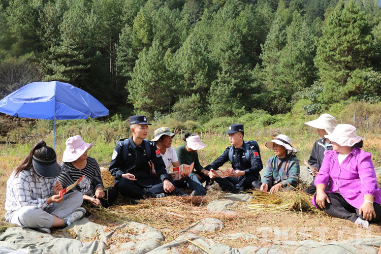 在田間地頭,趁著村民正坐在田坎上休息,“背包民警”向大家介紹:“習(xí)近平總書記在二十大報告中提出,增進民生福祉,提高人民生活品質(zhì)……”“背包民警”邊宣講邊向村民們發(fā)放了自己印發(fā)的黨的二十大精神宣講手冊,據(jù)了解,考慮到轄區(qū)群眾以中老年人為主,大多數(shù)認識漢字不多,所以“二十大精神宣講手冊”采取圖文并茂的方式,用最通俗易懂的話向群眾解釋二十大報告的內(nèi)容。