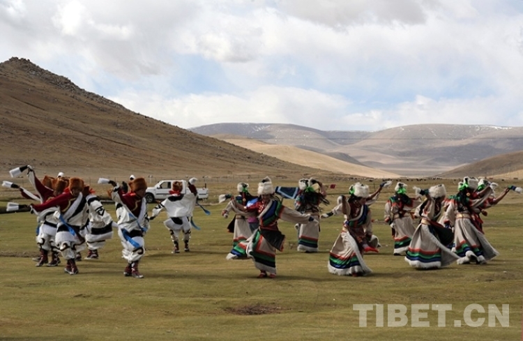 這是班戈縣諧欽民間藝術團的年輕舞蹈演員,在家鄉(xiāng)草原跳起歡快的“鍋莊”舞(唐召明2015年5月21日攝)