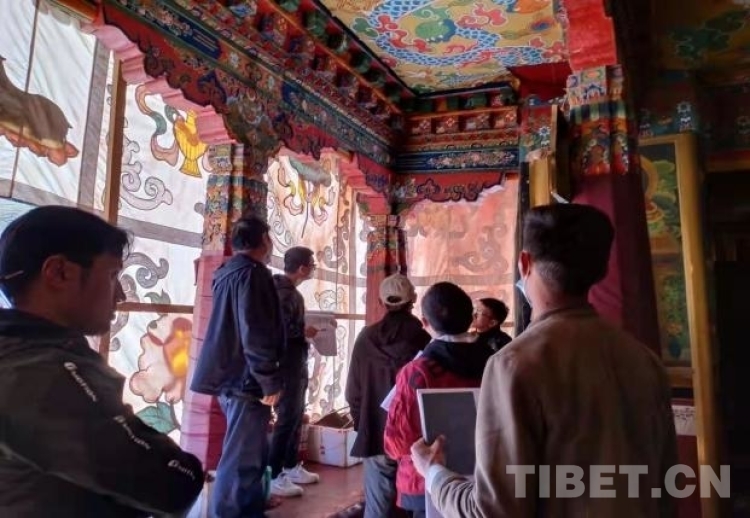 圖為2021年,西藏民族大學(xué)實(shí)習(xí)生參與檢查杰拉康寺木構(gòu)建筑的破損程度,并對設(shè)計(jì)方案提出意見