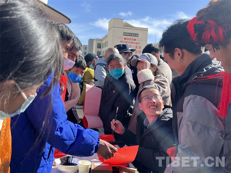 來到送“書法”現(xiàn)場,書法家們早早地來到活動現(xiàn)場,他們準備筆墨、鋪開紙張,為現(xiàn)場群眾書寫藏、漢文新年對聯(lián),“?!弊?、“吉祥如意”、“扎西德勒”等寓意美好的祝福。書法家協(xié)會副主席祖牛拉巴次仁說:“從春節(jié)開始,我們書法家們?nèi)W校、社區(qū)、搬遷安置點等地,書寫了超過1萬件的書法作品。這些作品深受大家的喜愛,我們后續(xù)也會繼續(xù)開展送‘書法’公益活動”。現(xiàn)場群眾聚集在送“書法”現(xiàn)場,“西熱措姆”“張文青”“索朗旺青”“朗嘎達瓦”……孩子們爭先恐后請書法家把自己的名字寫在紅紙上?!斑@是我的名字,我爸是西寧人,我媽是那曲的,我們是從那曲安多縣搬遷過來的,我現(xiàn)在在森布日幸福中學上初三,將來要考那曲高級中學”張文青拿著書家贈給她的“名字”用流利的那曲話對記者說。