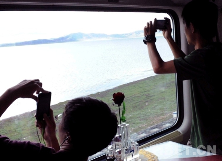 這是京藏列車通過(guò)西藏錯(cuò)那湖時(shí),旅客們紛紛用手機(jī)拍攝美景(唐召明2012年8月12日攝)