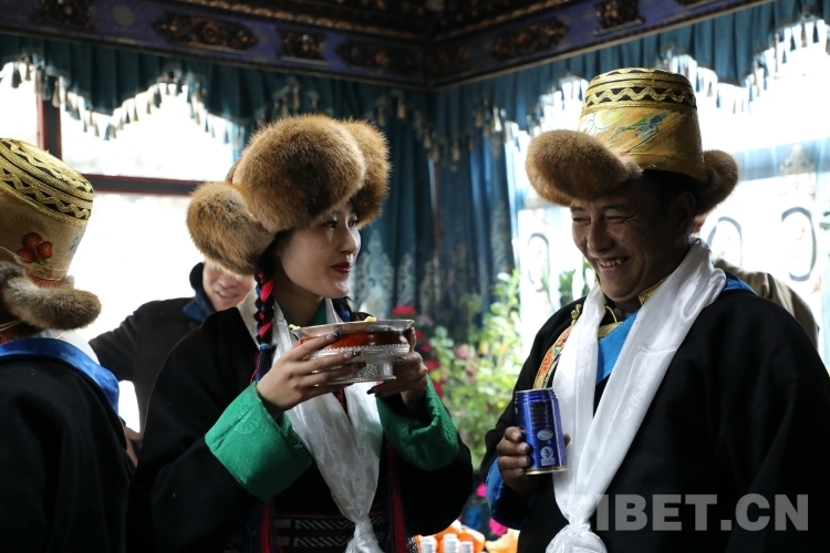 天亮以后,扎西江村一家人穿上新衣服,輪流敬切瑪、喝青稞酒,互道“扎西德勒”。扎西江村家的小女兒達娃倉決吃切瑪?shù)臅r候,先用拇指和食指抓起一小撮糌粑灑向空中3次,表示敬天地,然后把糌粑放進自己嘴里。喝青稞酒也同樣如此,要先用雙手接過酒杯,然后左手拿杯,右手無名指輕輕地在杯中蘸酒,彈向空中,如此反復(fù)三次。