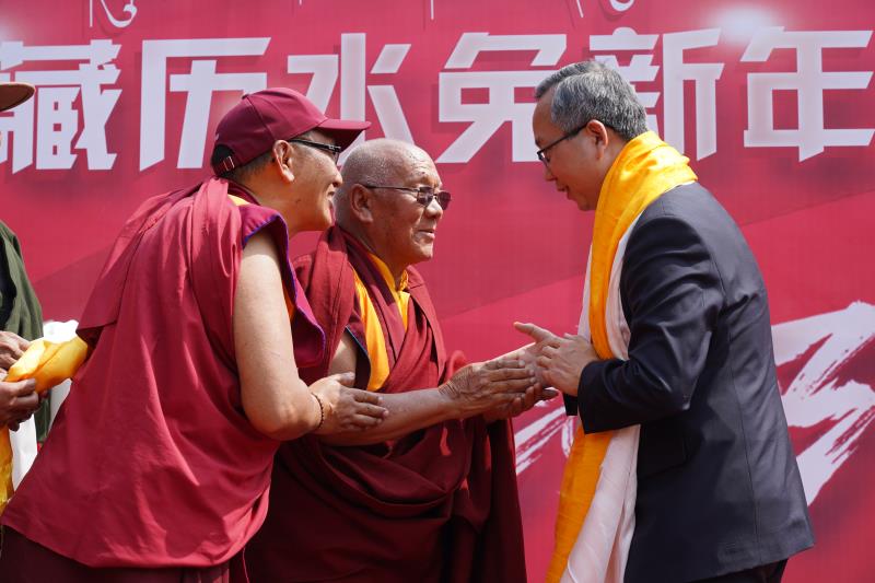 此系中國駐尼泊爾使館自疫情暴發(fā)以來首次舉辦藏歷新年招待會。活動現(xiàn)場熱烈喜慶、其樂融融,吉祥桌、切瑪盒洋溢著濃濃的藏歷新年氣息,大紅燈籠、吉祥結(jié)烘托出喜慶的節(jié)日氛圍,令藏胞們感受到家的溫暖。陳松大使與藏胞們互致祝福,互道“羅薩扎西德勒”,藏胞們向陳松大使敬獻哈達并合影留念。
