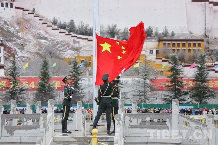28日清晨,瑞雪洗禮拉薩,處處煥然一新,在干凈清新的氣息中,來自西藏各族各界的代表2000余人齊聚布達(dá)拉宮廣場,以升國旗、唱國歌的方式紀(jì)念百萬農(nóng)奴解放64周年。