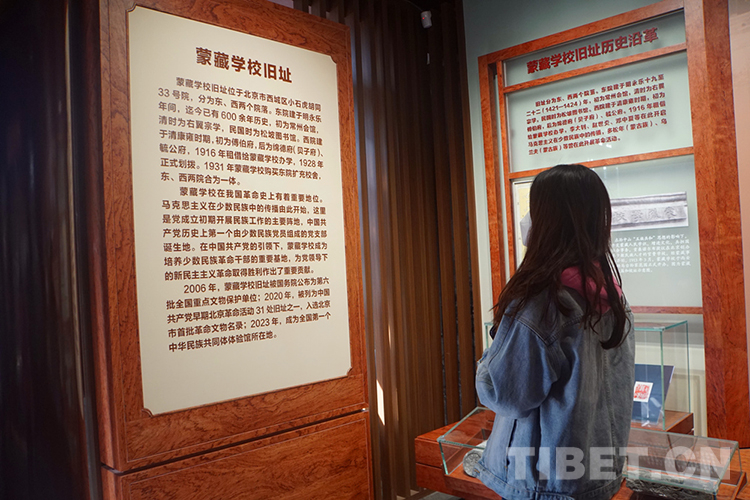 舊址西院,“蒙藏學(xué)校舊址專題展”主要展示舊址歷史沿革和革命活動(dòng),蒙藏學(xué)校學(xué)生參加五四運(yùn)動(dòng);李大釗、鄧中夏、趙世炎等對(duì)蒙藏學(xué)校青年的馬克思主義啟蒙和革命引導(dǎo);烏蘭夫、多松年 等 蒙藏學(xué)校進(jìn)步青年參加校內(nèi)外革命活動(dòng)……突出展現(xiàn)中國共產(chǎn)黨成立后在這里組織開展革命斗爭的歷史?!爸腥A一脈 同心筑夢”主題展分為“共同締造新中國”“團(tuán)結(jié)建設(shè)新社會(huì)”“攜手奮斗繁榮路”“同心奮進(jìn)新時(shí)代”4個(gè)部分。展出照片420多幅,實(shí)物、文獻(xiàn)、檔案280余件,藝術(shù)展 項(xiàng) 18項(xiàng),重點(diǎn)展示新時(shí)代民族工作取得的新的歷史性成就。