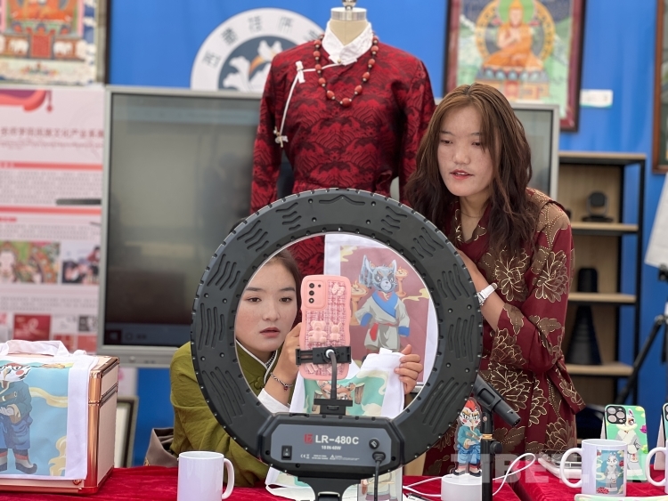 在展示交流區(qū),兩名穿著藏裝的姑娘正在通過(guò)直播向觀眾介紹有十二生肖圖案的被子、手機(jī)殼、筆記本等各類(lèi)產(chǎn)品,也吸引著現(xiàn)場(chǎng)嘉賓前來(lái)參觀。“這些作品是民族文化產(chǎn)業(yè)系學(xué)生的作品,圖案都是學(xué)生自己繪畫(huà)的原創(chuàng)文創(chuàng)產(chǎn)品。”西藏技師學(xué)院數(shù)字信息產(chǎn)業(yè)系教師桑珍介紹,“兩位姑娘是21級(jí)電商專(zhuān)業(yè)學(xué)生,通過(guò)這次活動(dòng)一方面希望自己得到鍛煉,另一方面也是為7月份的電商大賽做前期的培訓(xùn)?!?/p>