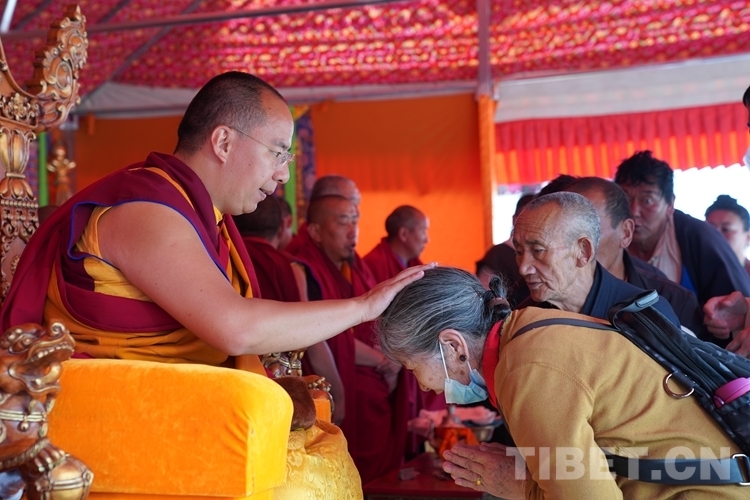 年逾七旬的洛桑巴姆得到班禪摸頂后倍感殊勝,激動(dòng)地落下了眼淚?!澳馨菀娀罘鹛貏e開心,得到活佛的摸頂賜福是我的福分。”洛桑巴姆不斷回頭面向班禪躬身祈禱,久久不愿離去。