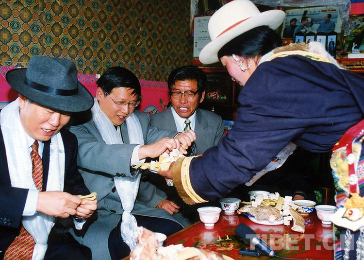 時任農(nóng)業(yè)部副部長范小建(左二)在隨慶祝西藏自治區(qū)和平解放五十周年代表團(tuán)再次回到西藏時,與代表團(tuán)其他成員一同在藏族群眾家中做客,了解生產(chǎn)和生活情況(范小建提供照片,2001年9月攝)