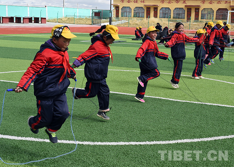 西藏那曲地區(qū)那曲縣(現(xiàn)那曲市色尼區(qū))羅瑪鎮(zhèn)中心小學(xué)的學(xué)生們在進(jìn)行跳繩比賽(唐召明2016年10月5日攝)