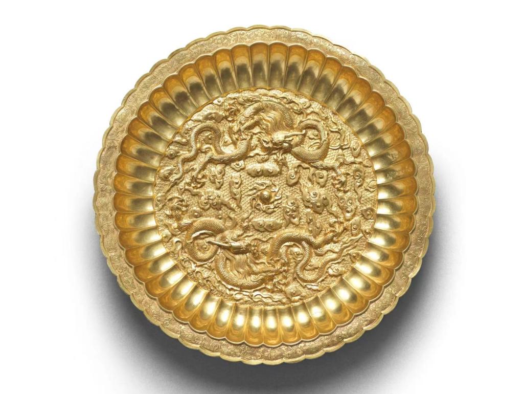 圖為公元18世紀雙龍戲珠菊瓣金盤