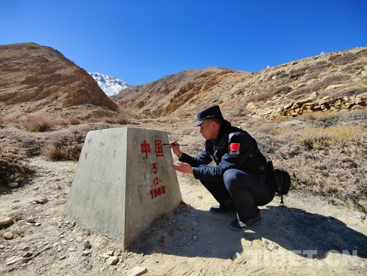 巡邏結(jié)束回到執(zhí)勤點(diǎn)后,邊巴次仁并沒有卸下執(zhí)勤裝備,而是拿著毛筆和紅油漆朝著執(zhí)勤點(diǎn)的河對(duì)岸走去,過河幾百米便是中尼5號(hào)界樁。“只有堅(jiān)守在邊境的我們才能體驗(yàn)到,除夕這天,為界碑描紅的自豪感?!彼贸雒P跟紅漆一筆一劃地描著界碑上的每一個(gè)字?!懊杓t界碑那一刻,眼前是界碑,身后是祖國(guó),我們守的是萬家燈火?!边叞痛稳恃凵駡?jiān)定地看著身前的界碑說。