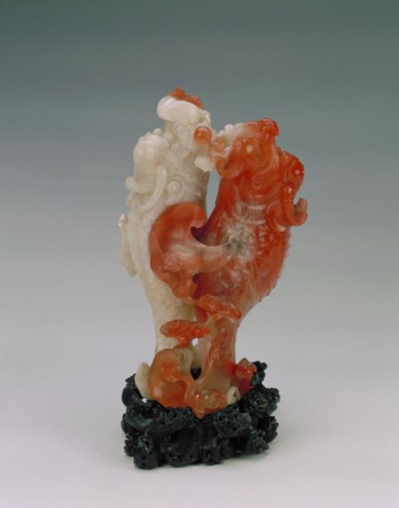 此件紅白瑪瑙巧做雙魚(yú)龍花插,通座高23厘米,最寬12.5厘米,雙魚(yú)式,魚(yú)口張開(kāi),魚(yú)身尾相連,紅白分明,雙雙呈身體向上躍起狀。魚(yú)身不僅有鰭還有雙翅,口外雕火珠,表明是魚(yú)龍。魚(yú)尾部開(kāi)叉形成器足,身側(cè)凸雕靈芝多個(gè)。下配以紫檀紅木雕海水紋座,海水浪花翻卷,兩只小水螺浮在浪尖上,二魚(yú)身置于座上,似兩條剛從水中躍起的欲跳龍門(mén)的錦鯉。紅魚(yú)尾部?jī)?nèi)側(cè)有陰刻橫行四字篆書(shū)款“乾隆年制”。為清中期瑪瑙俏作的代表性作品。(中國(guó)西藏網(wǎng) 綜合/周晶)