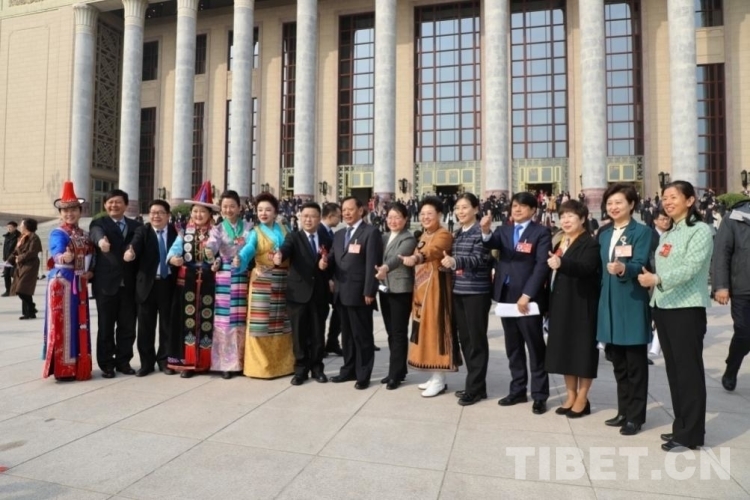 圖為2024年全國政協(xié)會(huì)議閉幕后,邊巴拉姆(左五)與全國政協(xié)委員們?cè)谌嗣翊髸?huì)堂前留影 攝影:王茜