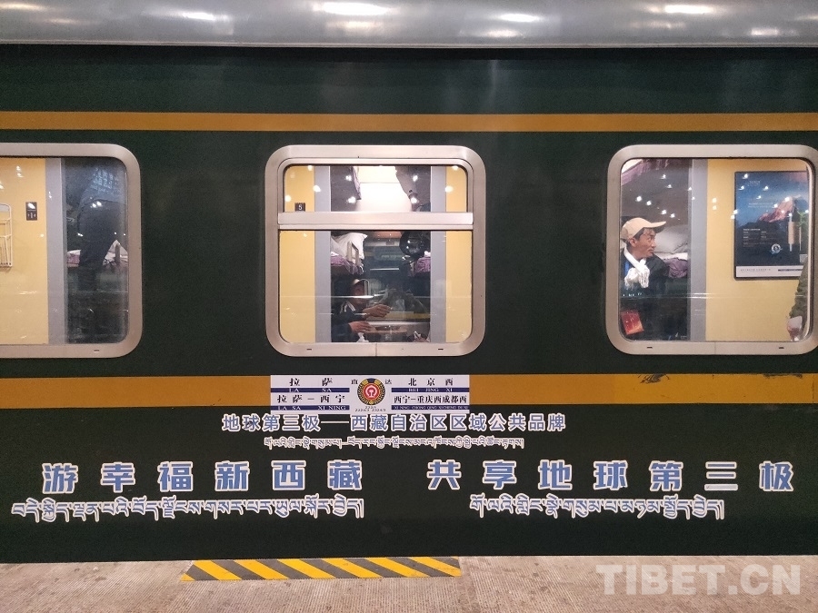 圖為考察學(xué)習(xí)團成員乘坐的張貼“地球第三極”標(biāo)識的鐵路Z21次列車 攝影:周晴晴
