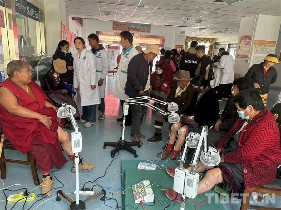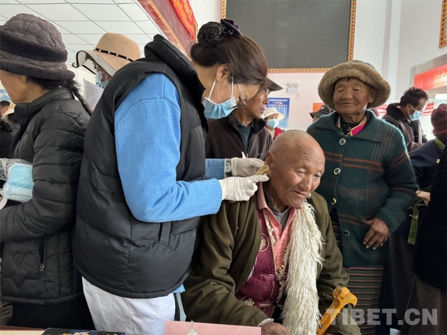 圖為洛隆縣藏醫(yī)院及人民醫(yī)院的醫(yī)療團(tuán)隊(duì)在現(xiàn)場開展平衡火罐、艾灸等中醫(yī)診療服務(wù) 供圖:洛隆縣藏醫(yī)院