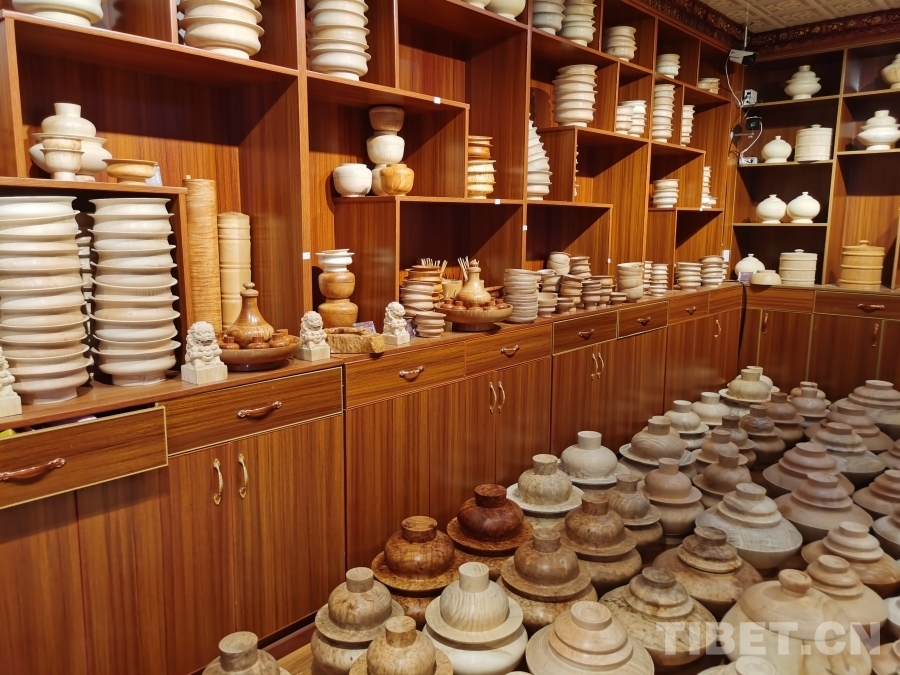 我們首先來到的是四川省非物質(zhì)文化遺產(chǎn)項目——藏族民間車模技藝體驗基地?;匾粚邮枪ぷ鲄^(qū),一位師傅正在全身心制作木質(zhì)生活用具,絲毫沒有察覺我們的到來。于是沒有過多打擾,我們徑直來到二樓展品陳列區(qū)。藏族民間車模技藝傳承人格絨次仁的兒子洛絨次仁拿起一個木碗,臉上露出樸實而靦腆的微笑介紹道,“這些都是選用樹瘤制作而成,一般選用鵝掌木、杜鵑等15類樹木,因為直木容易裂開。為了用具不裂開,處理后的樹瘤煮水后需晾干五至六個月,一個木碗制作工序可能要長達(dá)半年才能完成。此項技藝在家族傳承至今已有四代,我們要做就做好一點?!甭褰q次仁大哥希望更多人能了解這項非物質(zhì)文化遺產(chǎn),有更多人愿意來傳承學(xué)習(xí)這份技藝,有更多人喜歡他們制作的這些木質(zhì)生活用具。