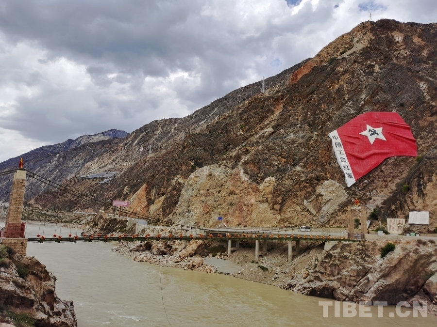 圖為中國工農(nóng)紅軍巖旗和橫跨金沙江的賀龍橋 攝影:鄒慧