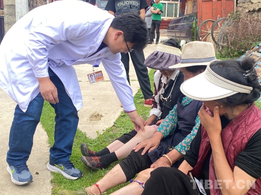 圖為趕往第二位患者家里途中,航空總醫(yī)院骨關(guān)節(jié)科石少輝主任為鄰近村民查看病情 攝影:格桑