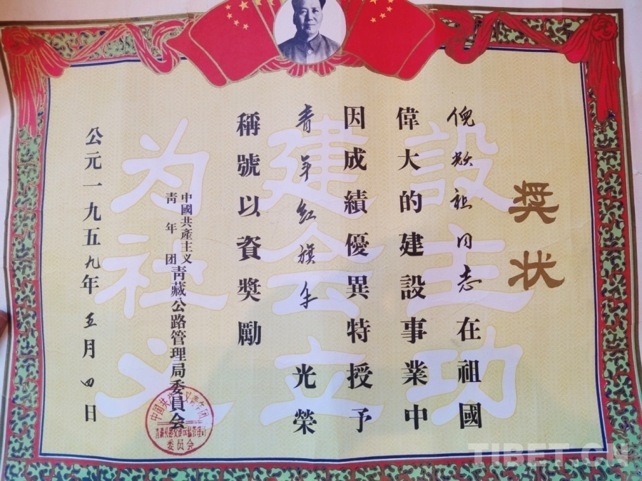 圖為1959年,中國共產(chǎn)主義青年團(tuán)青藏公路管理局委員會(huì)授予倪躍祖青年紅旗手光榮稱號(hào)的獎(jiǎng)狀