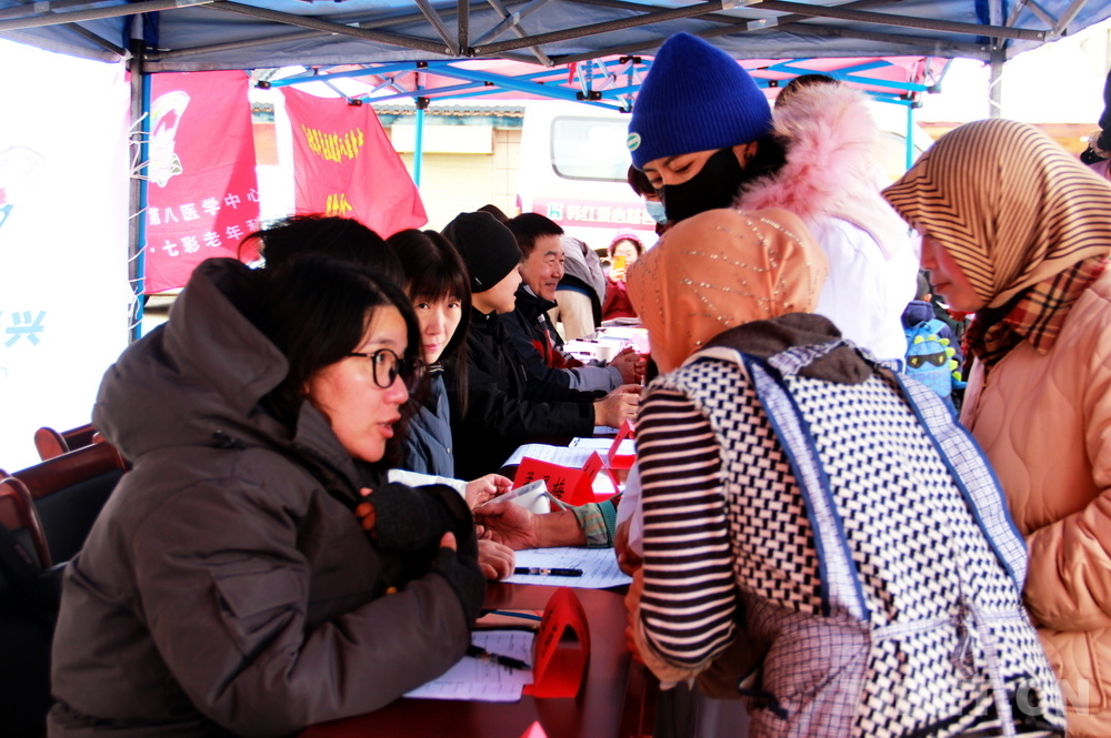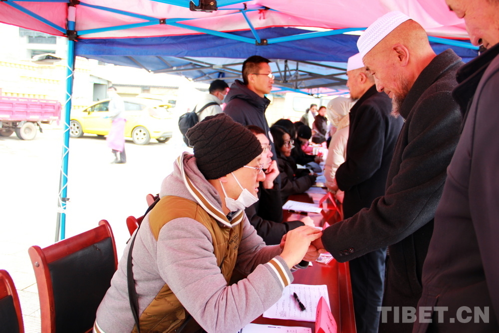 在郎木寺義診點(diǎn),此前為了容納更多群眾就診,因此將義診點(diǎn)設(shè)在了寺院門(mén)外的小廣場(chǎng)。盡管大雪紛飛,但提前得知義診消息的群眾已經(jīng)陸續(xù)趕來(lái),擔(dān)心臨時(shí)更換義診場(chǎng)所影響后續(xù)前來(lái)的群眾就診,醫(yī)務(wù)志愿者們毫無(wú)怨言地在臨時(shí)搭起的防雨棚下按時(shí)開(kāi)始了義診。