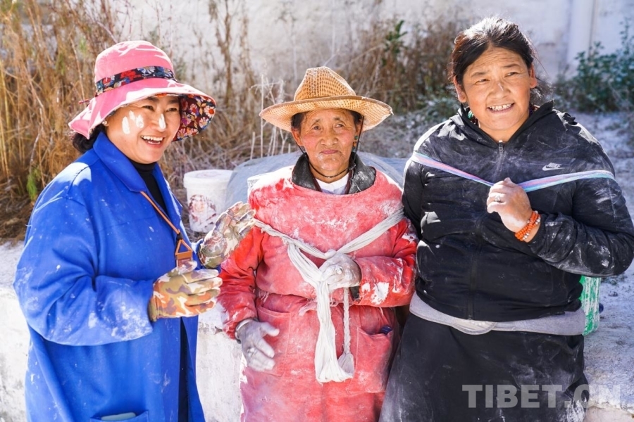 在布達(dá)拉宮粉刷現(xiàn)場(chǎng),有每年都堅(jiān)持參與的拉薩市民,有從遙遠(yuǎn)昌都、那曲等地專程趕來的群眾,亦有冬游西藏恰巧遇到參與其中的外地游客。他們不分年齡、不分性別,一起在拉薩溫暖的秋日暖陽中用熱情洋溢的笑臉參與到這一“甜蜜”的粉刷活動(dòng)中來。