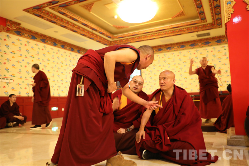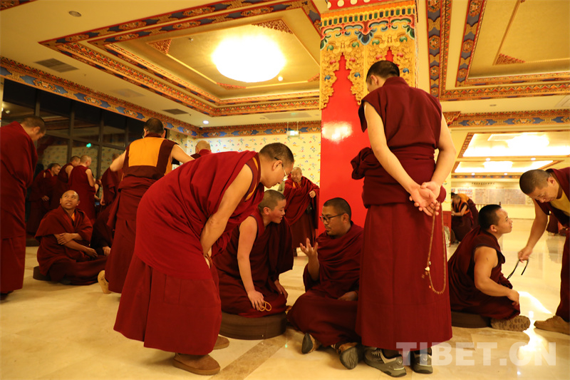 下午,師生們旁聽了中國特色社會主義理論和憲法與法律基礎等課程。晚上,開展了精彩非凡的辯經(jīng)活動。學員們各自組團尋找“對手”,大廳里激烈的辯論聲、擊掌聲此起彼伏,場面熱烈,氣勢逼人。辯經(jīng)是藏傳佛教中一種獨特的學習方式,通過對辯雙方邏輯清晰、言之有據(jù)的反復辯論,加深學習理解。