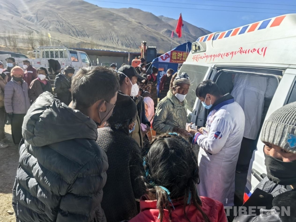 圖為日喀則邊那倉藏醫(yī)院醫(yī)護(hù)人員為災(zāi)區(qū)群眾巡診問診