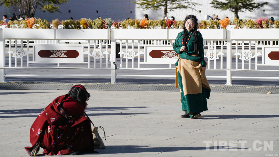 圖為游客在布達(dá)拉宮廣場(chǎng)拍攝藏裝寫(xiě)真 攝影:趙振宇