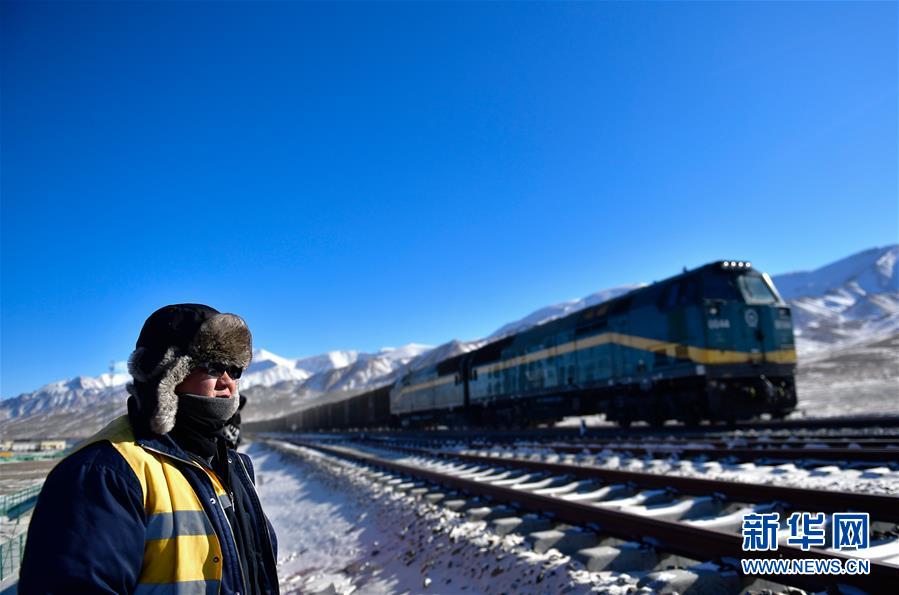 1月12日清晨,于本蕃(中)與工友在昆侖山口附近的青藏鐵路上施工。新華社記者 張龍 攝