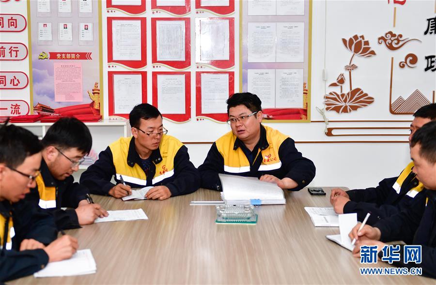 1月11日,在青藏鐵路望昆站,于本蕃(右三)召集工友開(kāi)會(huì)商定施工方案。新華社記者 張龍 攝