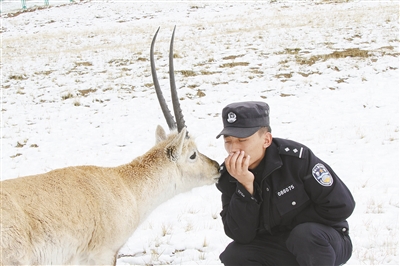 站在離它們不遠的地方,相互平靜地對視,許久,一只小藏羚羊才走上前來,把臉慢慢靠近蹲在地上的才仁多杰的面頰。