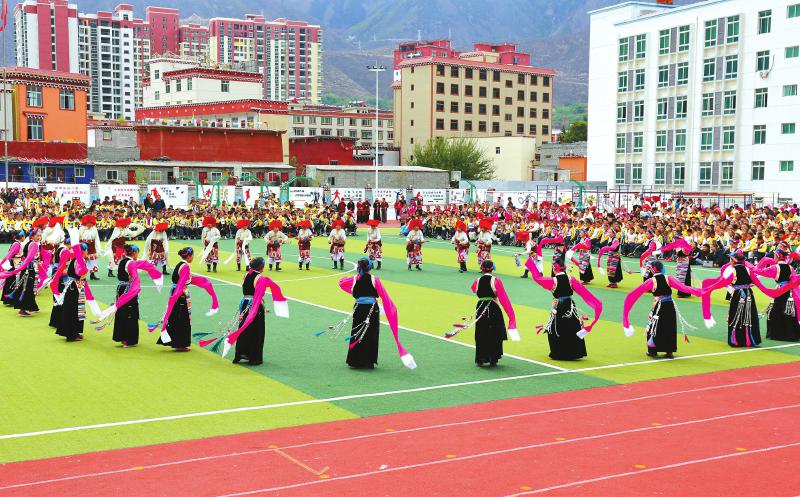 圖為非遺歌舞巴塘弦子進(jìn)校園活動(dòng)中,巴塘中學(xué)學(xué)生在學(xué)校操場(chǎng)表演巴塘弦子舞。巴塘縣委宣傳部供圖(資料圖)