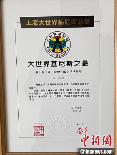 6月10日,青海省玉樹(shù)州治多縣唐蕃古道文化博物館發(fā)布信息稱(chēng),由該管收藏的國(guó)家級(jí)非物質(zhì)文化遺產(chǎn)——藏族民間文學(xué)手抄《康巴拉伊》最長(zhǎng)藏文書(shū)法長(zhǎng)卷,獲評(píng)“大世界基尼斯之最”(中國(guó)之最)。