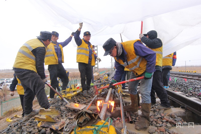但這還不夠,為了讓鋼軌充分舒放“筋骨”、釋放應力,職工們還必須切開鋼軌,緊接著進行焊聯(lián),這項工作由德令哈重點維修車間負責。車間主任郭鋒亮一邊組織職工開動切割機實施精準切割,一邊組織職工架起焊鍋。火花飛舞,火苗竄升,作業(yè)人員的對比服在火光和風雪的映襯下顯得更加熠熠生輝。最終,做完“伸展運動”的鋼軌在焊劑的作用下重新融合在了一起,經(jīng)打磨后再難區(qū)分彼此。
