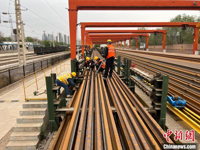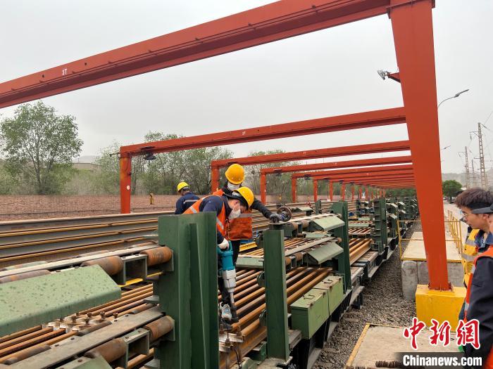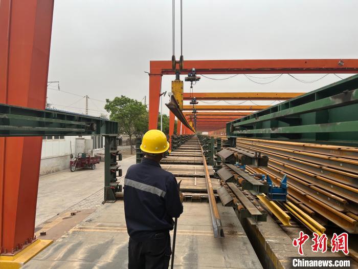 圖為職工正在擺放長軌。張遠(yuǎn) 攝