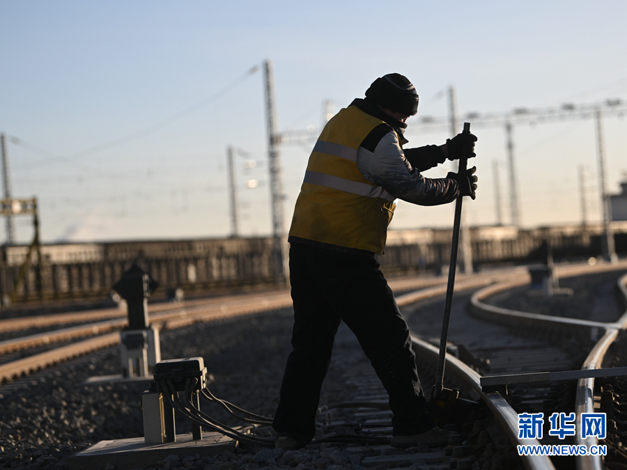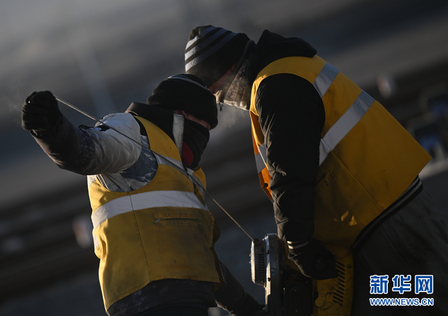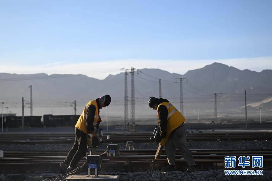 2月7日,中國(guó)鐵路青藏集團(tuán)有限公司格爾木工務(wù)段格南線路工區(qū)的職工在格爾木南站施工。新華社記者 張龍 攝