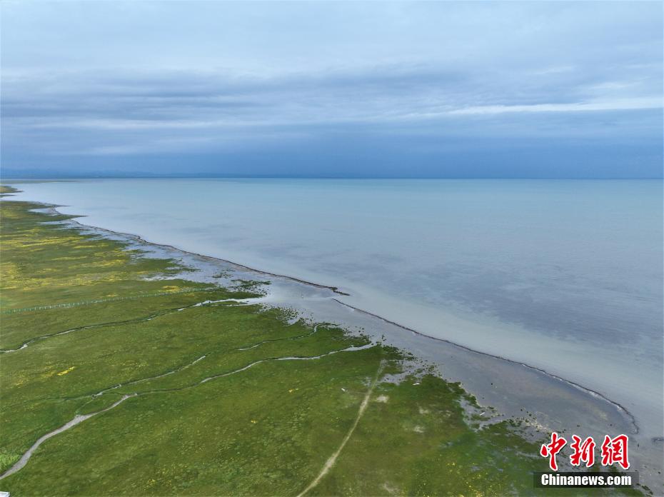 航拍青海湖北岸仙女灣:綠草如毯 湖水蕩漾