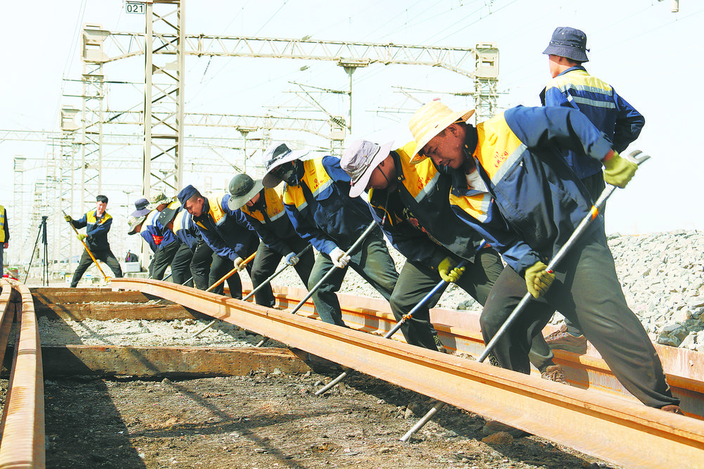 察爾汗線路車間職工在擺正鋼軌。東科力加 攝