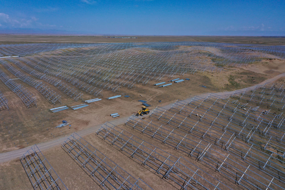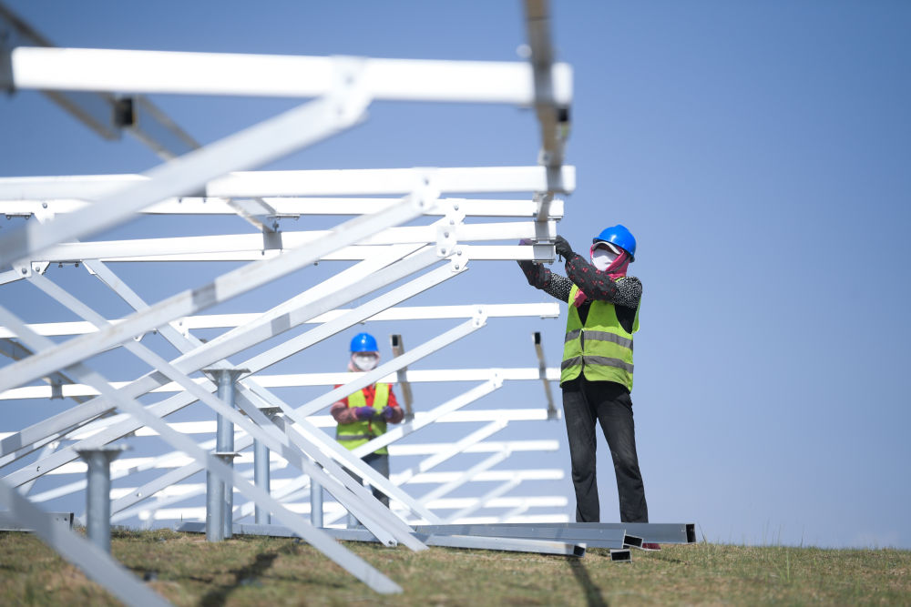 2022年6月8日,工人在黃河上游水電開發(fā)有限責(zé)任公司海南基地共和縣100萬千瓦光伏項(xiàng)目施工。新華社記者 張龍 攝