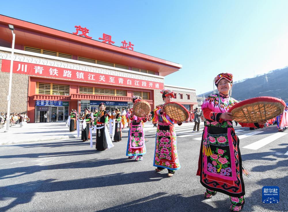 11月28日,在川青鐵路茂縣站,當(dāng)?shù)馗髯迦罕娫谡厩皬V場(chǎng)慶祝鐵路開通運(yùn)營(yíng)。新華社記者 王曦 攝